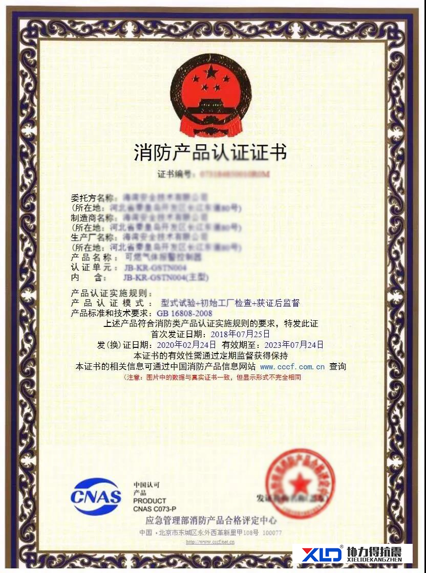 三、電氣火災&可燃氣體報警產(chǎn)品認證 2018年6月15日中國國家認證認可監(jiān)督管理委員會發(fā)布《市場監(jiān)管總局國家認監(jiān)委關于改革調整強制性產(chǎn)品認證目錄及實施方式的公告》,其中可燃氣體報警產(chǎn)品、電氣火災監(jiān)控系統(tǒng)、氣溶膠滅火裝置這三類產(chǎn)品不再進行3C強制性認證。 2018年6月25日消防產(chǎn)品合格評定中心針對電氣火災監(jiān)控系統(tǒng)與可燃氣體報警產(chǎn)品發(fā)布了新的認證實施規(guī)則。產(chǎn)品認證的基本模式為:型式試驗+企業(yè)質量保證能力檢查和產(chǎn)品一致性檢查+獲證后監(jiān)督。必要時,企業(yè)質量保證能力檢查(產(chǎn)品一致性檢查)可與型式試驗一并進行。 證書樣式如下: