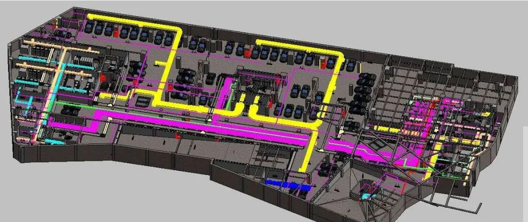 此管井長2900mm寬700mm,管井內(nèi)有二十根立管,空間比較緊張,如圖中排布使立管避開了梁,各系統(tǒng)可以方便的引出支管,而且留了檢修的空間。豎井中如果有管道采用焊接的連接方式,那么排布時還要考慮焊接操作的空間,尤其是處于墻角的管道。 04、BIM地下室區(qū)域 地下室區(qū)域在做綜合排布的時候需要注意的地方很多,除了走廊區(qū)域比較重要以外,還需要重點關(guān)注行車道,車位,坡道,防火卷簾門等位置。