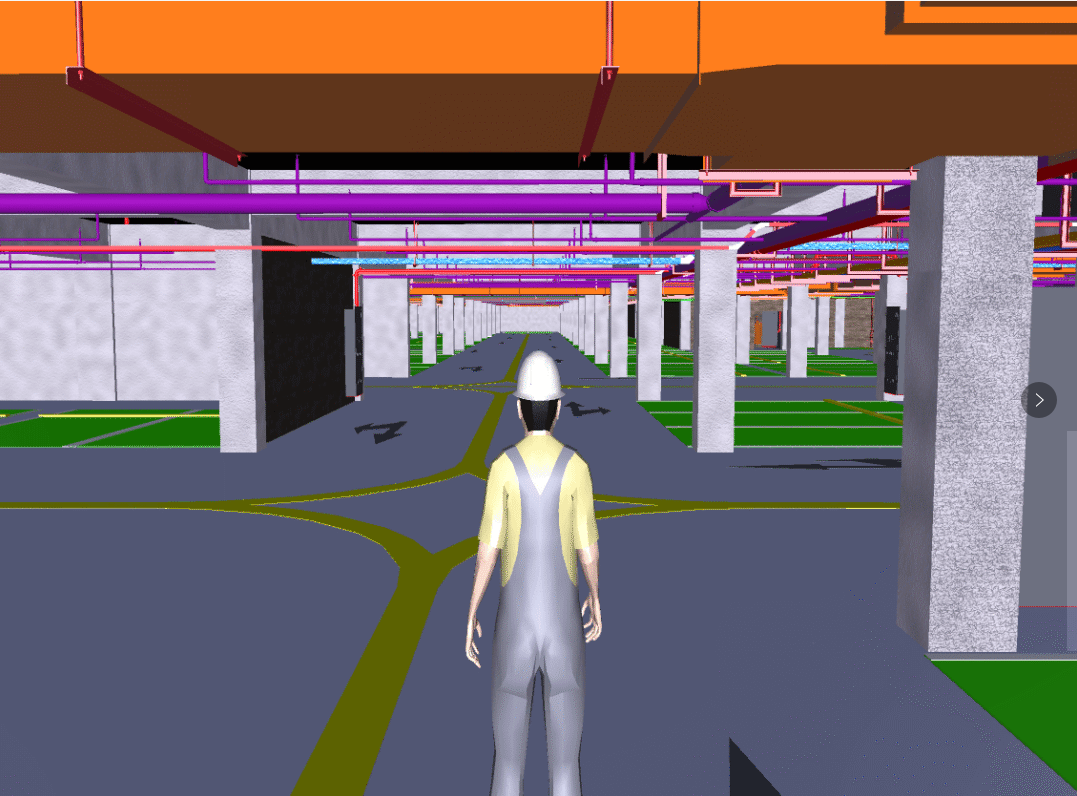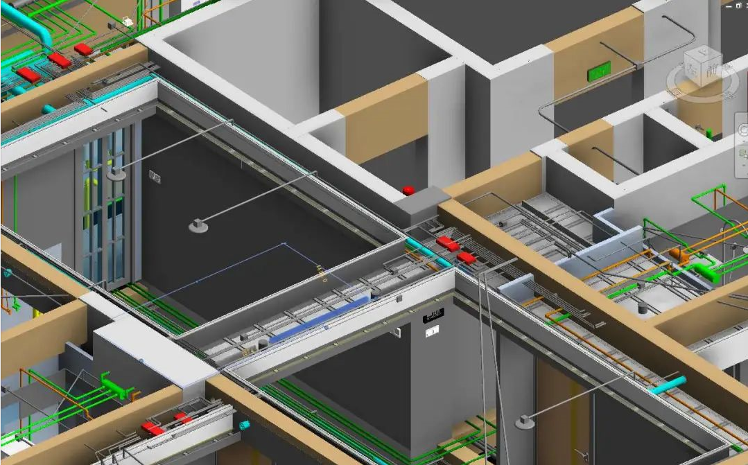 人防區(qū)域。前期應(yīng)該按照設(shè)計提資的詳圖進行建模型的搭建。其中要注意設(shè)備的安裝,一般有過濾吸收器、油網(wǎng)管式過濾洗塵器、靜壓箱、電動腳踏兩用風(fēng)機。還要注意穿墻處需要加套管保護管道。 防火卷簾門區(qū)域。上圖防火卷簾門處的管線在卷簾門兩側(cè)布置,避免了管線與防火卷簾門的碰撞。 行車道區(qū)域。主風(fēng)道靠近車道邊側(cè)排布,避免了中間行車區(qū)域凈高過低。此處有大梁,水平管線標(biāo)高比較低,所以車道過路位置的管線都上翻,抬高了車道中間行車位置的凈高。