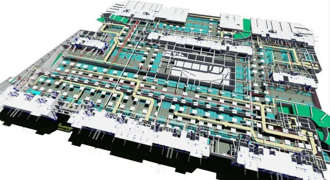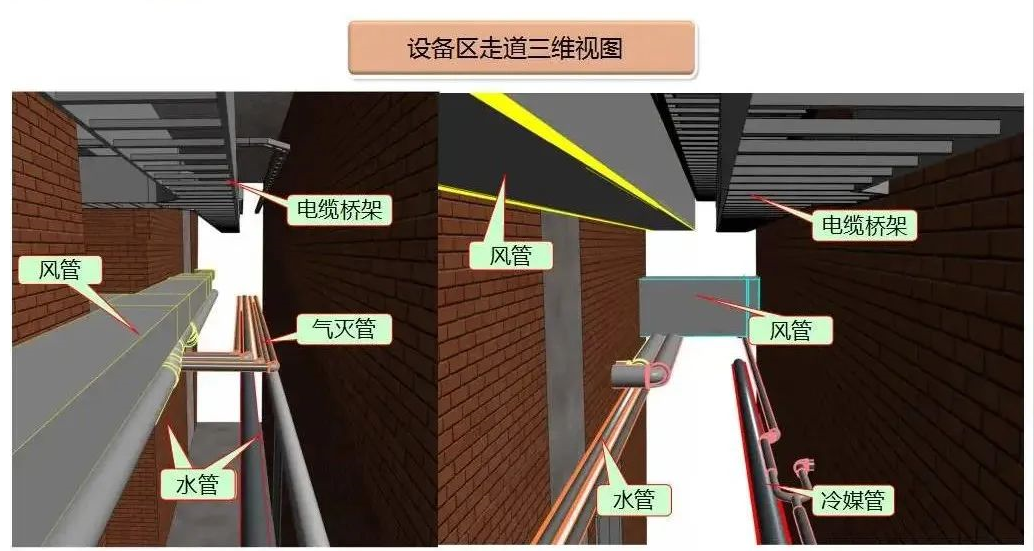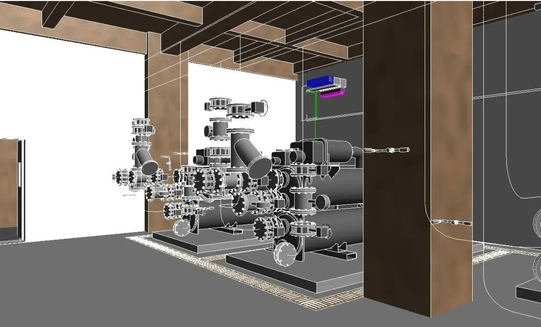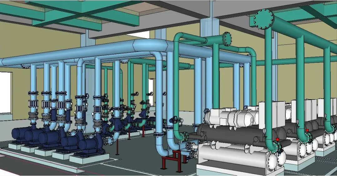 此走廊寬3100mm,其中有一根1250X450mm的送風(fēng)管,一根800X450mm排煙管。一根強電橋架,兩個弱電橋架,五根空調(diào)水管,兩根給排水水管。此處梁尺寸為400X700mm,梁下水管同一標(biāo)高水平布置;水管下方風(fēng)管底標(biāo)高對齊,排煙管距墻150mm,兩根風(fēng)管管壁間距150mm,考慮用通用支吊架。三根橋架距墻150mm,垂直布置。其中風(fēng)管距墻150mm,留出法蘭連接空間;風(fēng)管與橋架水平間距350mm,留出橋架與水管的維護檢修空間。 02、BIM機房區(qū)域 常見的機房有消防泵房,空調(diào)機房,通信機房,冷熱源機房等,機房的管線尺寸較大,而且空間有限。在排布機房管線時,首先要保證系統(tǒng)正確的情況下合理的調(diào)整布置管線。另外要了解設(shè)備的尺寸,避免由于管線排布較低造成與設(shè)備的碰撞。排布管線時還要考慮出入口部的管線,機房里的管線應(yīng)該與機房外管線合理的連接,統(tǒng)籌各方面將機房排布合理美觀。