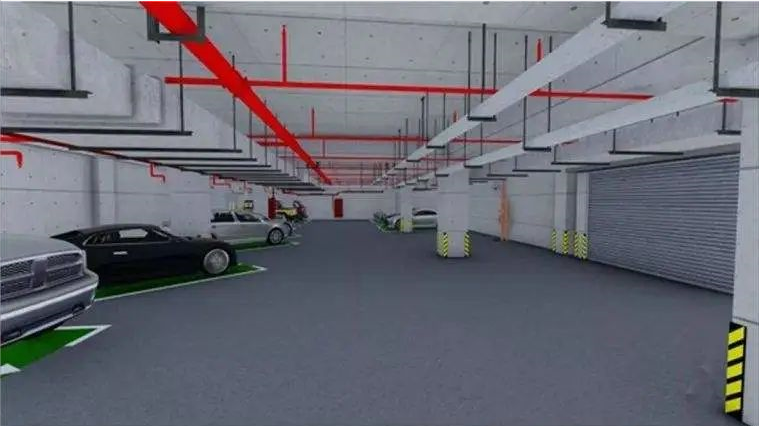 2、車位。一般要求凈高位2300mm,有的項目還會有機械車位,凈高要求一般為4000mm左右,同時還需考慮車位上方噴淋頭的安裝空間,一般需要200mm的安裝空間。 3、防火卷簾門。需要特別注意防火卷簾門位置,管線不允許穿防火卷簾門以及門上方的卷簾盒。(卷簾盒高度一般為500—800mm) (附圖:一張車位三維圖、一張車道三維圖、一張管線過防火卷簾的三維圖、人防三維圖)
