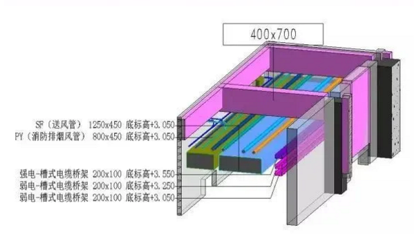 2、橋架的排布。管廊里面管線比較密集,而且橋架排布在水管的上面布置,不注意的話橋架的檢修空間會被水管占用,排布時應(yīng)該考慮給橋架留出至少300X300mm維護檢修的空間。