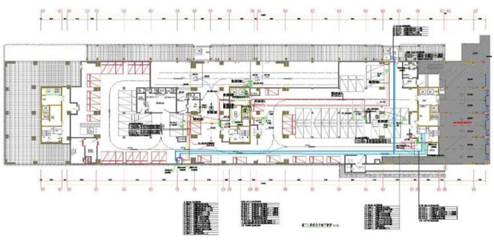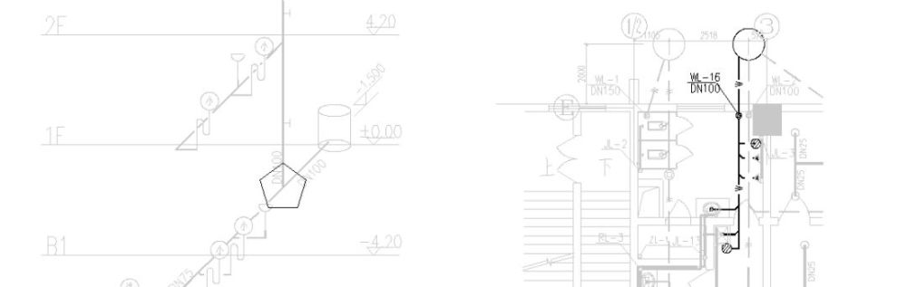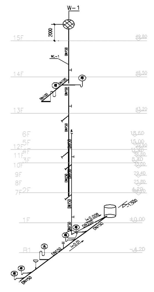 一般常用的: 給水管道-J,如果分高低區(qū)通常用首字母表示即高區(qū)-G,低區(qū)-D。 排水管道-W,表示污水。也有-F,就是廢水。很少見(jiàn)有用-P表示的。 消火栓管道-XH。 自動(dòng)噴淋管道-Z或者-ZP;雨水管道-Y; 采暖管道-R,一般實(shí)線(xiàn)表示供水管,虛線(xiàn)表示回水管。 壓力排水-PY;冷凝水管道-N。管道立管-L。 另外設(shè)備的型號(hào)字母: Q-流量或者風(fēng)量;H-揚(yáng)程;N-功率;P-壓力;QW-潛污泵。 其他閥門(mén)、器具之類(lèi)的都是用圖形區(qū)分。 JL-給水管;WL-污水管;YL-雨水管;RJL-熱給水;RHL-熱回水。 4、讀圖 4.1、給排水工程圖紙由給排水系統(tǒng)圖(或系統(tǒng)原理圖)、給排水平面圖、圖紙說(shuō)明組成。 4.2、給排水系統(tǒng)圖和原理圖的區(qū)別: 系統(tǒng)圖:較為嚴(yán)格的按照軸測(cè)圖的繪圖原理繪制,主要突出空間內(nèi)各個(gè)方向的線(xiàn)條的相互關(guān)系,立體感較強(qiáng)。 原理圖:以突出系統(tǒng)原理和構(gòu)成為原則,各線(xiàn)條的空間還原性較差,不利于構(gòu)建整體的立體感。但是清晰易懂。 4.3、給排水專(zhuān)業(yè)系統(tǒng)圖中,平行、垂直、45度線(xiàn)條繁多,空間關(guān)系上前后疊影但不相連的管道也很多,再加上標(biāo)高、管徑、樓層線(xiàn)等輔助線(xiàn)條林立,最容易造成系統(tǒng)圖識(shí)圖中的找錯(cuò)線(xiàn)條、并錯(cuò)管道的現(xiàn)象,所以我們?cè)谙到y(tǒng)圖識(shí)圖時(shí)可以采用刪除或者遮蔽一些管道的做法,使我們希望看清楚的部分凸顯出來(lái),會(huì)更加有利于我們準(zhǔn)確、清晰地識(shí)圖。 系統(tǒng)簡(jiǎn)化: 在通讀污水系統(tǒng)(W-1系統(tǒng))之后發(fā)現(xiàn)從2層開(kāi)始一直到14層,圖紙上表達(dá)出了一個(gè)意思:WL-1立管從上至下,樓層的排水橫管構(gòu)造都一樣,圖紙上僅表達(dá)了第 14層的排水橫管。WL-1立管從上至下,加上一層設(shè)置的一根橫管,形成了整個(gè)W-1系統(tǒng)。我們對(duì)W-1系統(tǒng)進(jìn)行簡(jiǎn)化后得到下圖:
