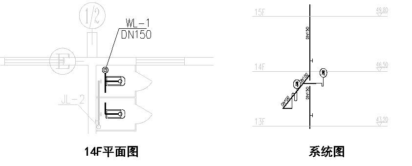 生活污水系統(tǒng)原理圖WL-1系統(tǒng)簡(jiǎn)化 4.4、給排水平面圖和系統(tǒng)圖的結(jié)合 給排水工程平面圖主要表達(dá)各層用水房間所配置的衛(wèi)生器具及給排水管道、附件在平面位置情況。 給排水工程系統(tǒng)圖(或系統(tǒng)原理圖)主要表達(dá)從底層到頂層管道立體走向,常用斜軸側(cè)投影的方法繪制。(表示內(nèi)容:管道的空間布置,各管段管徑,坡度,標(biāo)高以及附件在管道上的位置。)所以,需將系統(tǒng)圖和平面圖緊密結(jié)合。才能清楚的知道完整的做法。 例如: 4.4.1橫置的“T”符號(hào)是排水立管的檢查口?;景凑彰?jī)蓪右粋€(gè)設(shè)置,這些內(nèi)容在平面圖中無(wú)法繪出,所以要仔細(xì)看系統(tǒng)或者原理圖。 4.4.2平面圖和系統(tǒng)圖的標(biāo)高:排水系統(tǒng)的橫管位于本層樓層之下,在平面圖上看,如14層的排水平面圖的管道,示意的是在14層樓板之下的管道。在系統(tǒng)上這部分橫管是歸屬13層到14層之間。需清楚的知道需看系統(tǒng)圖的哪個(gè)部位。
