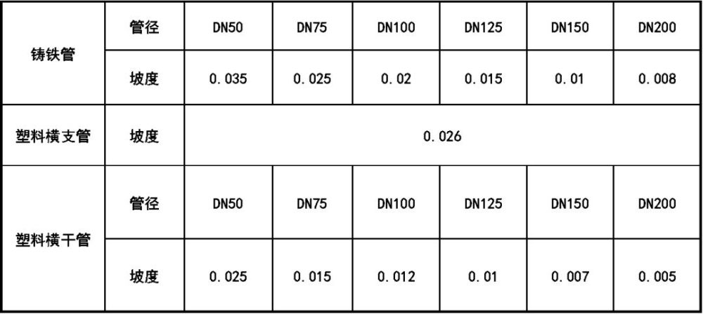 從上面系統(tǒng)圖圈住部分看,該處及為三通,但是結(jié)合平面圖,可以發(fā)現(xiàn),該處應(yīng)使用斜三通。 設(shè)計(jì)圖中排水管道未注明坡度的, 均采用標(biāo)準(zhǔn)坡度。即: