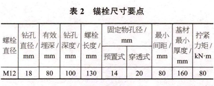 抗震支架,并綜合考慮將抗震支架與普通支吊架和固定支架,以減少重復設置,節(jié)約成本,避免因支吊架過多而影響觀感。 3.施工步驟及注意事項 施工流程為:預制加工―組裝—鉆孔或與鋼結(jié)構(gòu)固定4裝就位。 3.1切割及加工注意事項 C形槽鋼切割時開口面應朝下,以免切割時發(fā)生變形。切割斷面應垂直,毛刺應打磨光滑。所有部件應按深化圖要求選用標準成品件,確保其機械性能滿足設計要求。 3.2鉆孔錨固注意事項 (1)錨固應在一次結(jié)構(gòu)的墻體、頂板或結(jié)構(gòu)柱上進行,抗震支架接觸面應平整牢固;錨固深度范圍內(nèi)的混凝土強度等級應達到C30及以上。 (2)錨栓應符合表2。