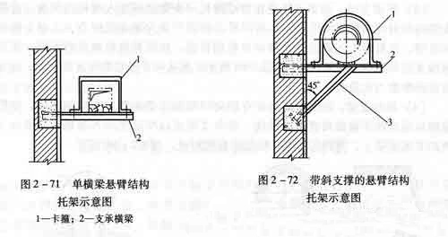 03、托架、吊架、卡架 按照其自身的結(jié)構(gòu)形式,管道支架可分為托架、吊架、卡架。 當(dāng)管道沿墻或柱敷設(shè)時(shí),可采取托架或卡架來(lái)把管道從下面托起或從水平方向上卡住,如圖2-71和圖2-72所示。