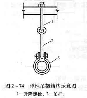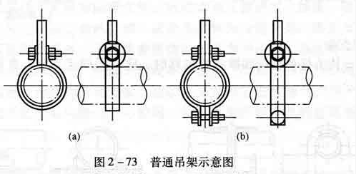 當(dāng)管道是沿著建筑的樓板或屋面、梁、桁架等安裝,不能靠墻體或柱子支撐時(shí),就必須用吊架將管道加以固定。按照吊掛的形式不同,又可分普通吊架和彈性吊架兩種,如圖2-73和圖2-74所示。
