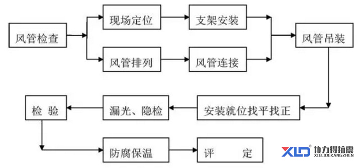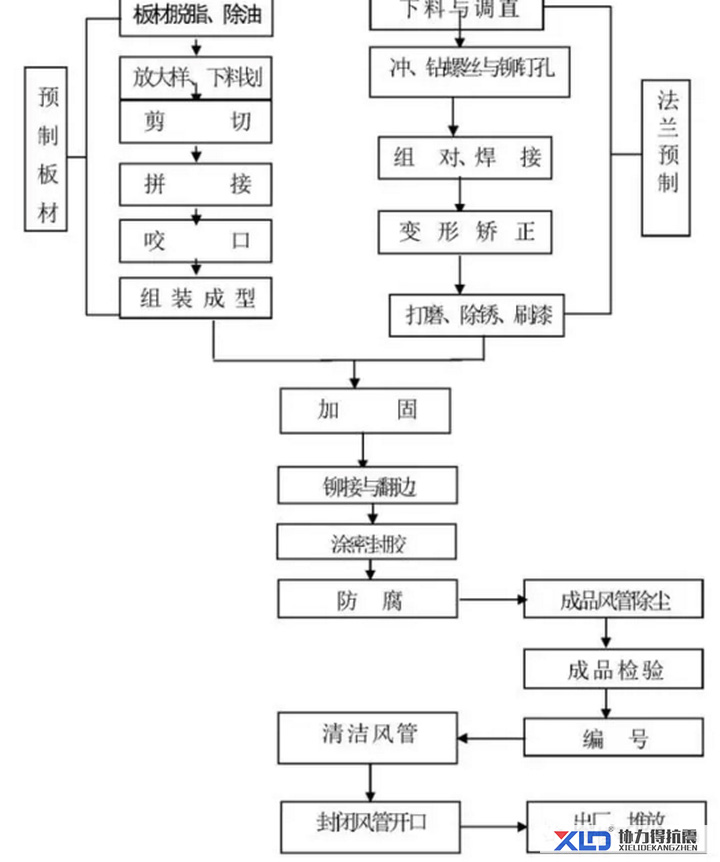 風(fēng)管的制作與安裝(企業(yè)版)發(fā)表時間:2021-05-25 13:59作者:湖北協(xié)力得工程科技有限公司 一、所有風(fēng)管及其配件的制作、安裝必須符合《通風(fēng)與空調(diào)工程施工質(zhì)量驗收規(guī)范》(GB50243-2002)、及國家建材和質(zhì)量保證體系并應(yīng)滿足消防部門的檢測要求。 二、鍍鋅風(fēng)管的種類: 根據(jù)法蘭的不同分為:共板法蘭、角鐵法蘭、插條式法蘭、德國法蘭等。 ![]() 三、空調(diào)排風(fēng)、通風(fēng)系統(tǒng)、消防排煙系統(tǒng)采用鍍鋅鋼板風(fēng)管,板材厚度按下表確定: 鍍鋅鋼板風(fēng)管板材厚度 ![]() 四、風(fēng)管的制作: 潔凈風(fēng)管制作工藝流程: ![]() 1.風(fēng)管與配件的咬口應(yīng)緊密,寬度應(yīng)一致,圓弧應(yīng)均勻,兩端面平齊,風(fēng)管無明顯的扭曲與翅角,表面應(yīng)平整,凹凸不大于10mm; 2.風(fēng)管邊長(直徑)小于或等于300mm時,邊長(直徑)的允許偏差為±2mm;風(fēng)管邊長(直徑)大于300mm時,邊長(直徑)的允許偏差為±3mm; 3.管口應(yīng)平整,其平面度的允許偏差為2mm;矩形風(fēng)管兩條對角線長度之差不應(yīng)大于3mm; 4.風(fēng)管與法蘭采用鉚接連接時,鉚接應(yīng)牢固、不應(yīng)有脫鉚和漏鉚現(xiàn)象;翻邊應(yīng)平整、緊貼法蘭,其寬度應(yīng)一致;咬縫與四角處不應(yīng)有開裂與孔洞。 5.風(fēng)管內(nèi)外表面不應(yīng)有嚴(yán)重的劃痕; 6.風(fēng)管板材拼接的咬口縫應(yīng)錯開,不應(yīng)形成十字交叉縫; 7.潔凈空調(diào)系統(tǒng)風(fēng)管不應(yīng)采用橫向接縫; 8.風(fēng)管為聯(lián)合角咬口形式,單咬口長度為6mm~8mm。單咬口包括直管的單邊、彎頭三通等的弧片都應(yīng)滿足咬口長度。 9.角鐵法蘭風(fēng)管的翻邊應(yīng)緊貼法蘭,翻邊量均與、寬度應(yīng)一致,不應(yīng)小于6mm,且不應(yīng)大于9mm。
