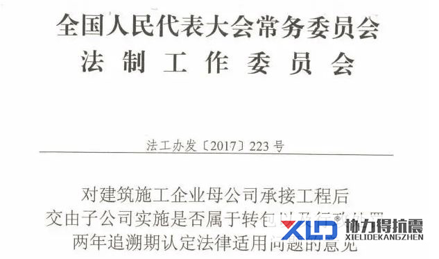 2017年,住建部曾向全國人大法工委發(fā)出請示函,全國人大法工委作出《對建筑施工企業(yè)母公司承接工程后交由子公司實(shí)施是否屬于轉(zhuǎn)包以及行政處罰兩年追溯期認(rèn)定法律適用問題的意見》(法工辦發(fā)[2017]223號(hào),以下簡稱《意見》)認(rèn)為:- 關(guān)于母公司承接建筑工程后將所承接工程交由其子公司實(shí)施的行為是否屬于轉(zhuǎn)包的問題。結(jié)合建筑法第二十八條、合同法第二百七十二條以及招標(biāo)投標(biāo)法第四十八條的規(guī)定,上述法律對建設(shè)工程轉(zhuǎn)包的規(guī)定是明確,這一問題屬于法律執(zhí)行問題,應(yīng)當(dāng)根據(jù)實(shí)際情況依法認(rèn)定、處理。